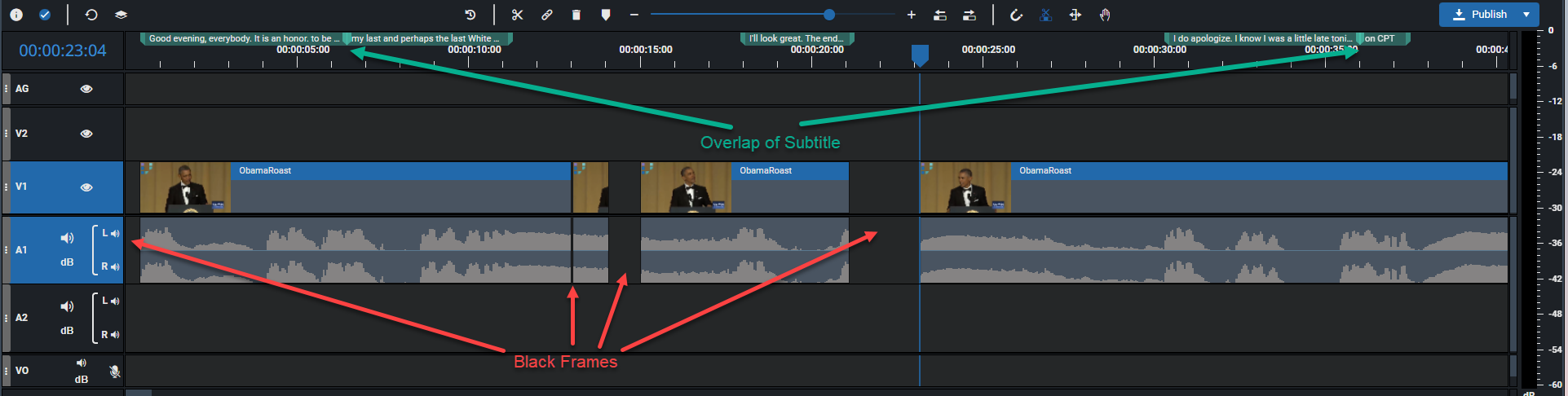 • Overlapping Subtitles: When importing subtitles from a source media (see Timeline Markers and Subtitle Marker) it might happen that 2 markers overlap each other. While this is valid in general it would break a publish if the user selects to encode it into the video stream using the burn in option. In this case the VidiEditor GUI will show an error and blocking the publish.
