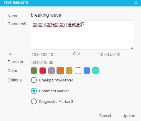 Example of VidiEditor Edit Marker dialog with three types of markes shown as “options”