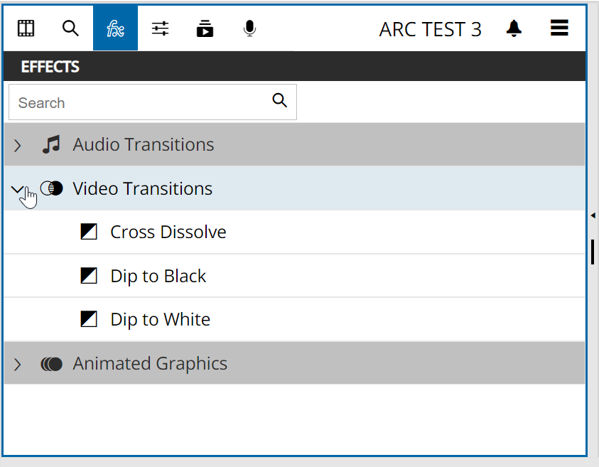 To add a dissolve, go to VidiEditor's effects panel and choose the desired transition. It can be selected from the effects pane listing available transitions.