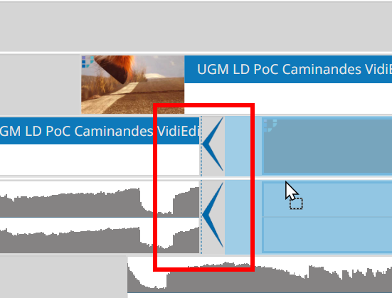The snap functionality also is available when triming segments. This especially is of advantage if media is arranged over different tracks or for doing L or J cuts on unlinked audio and video segments.