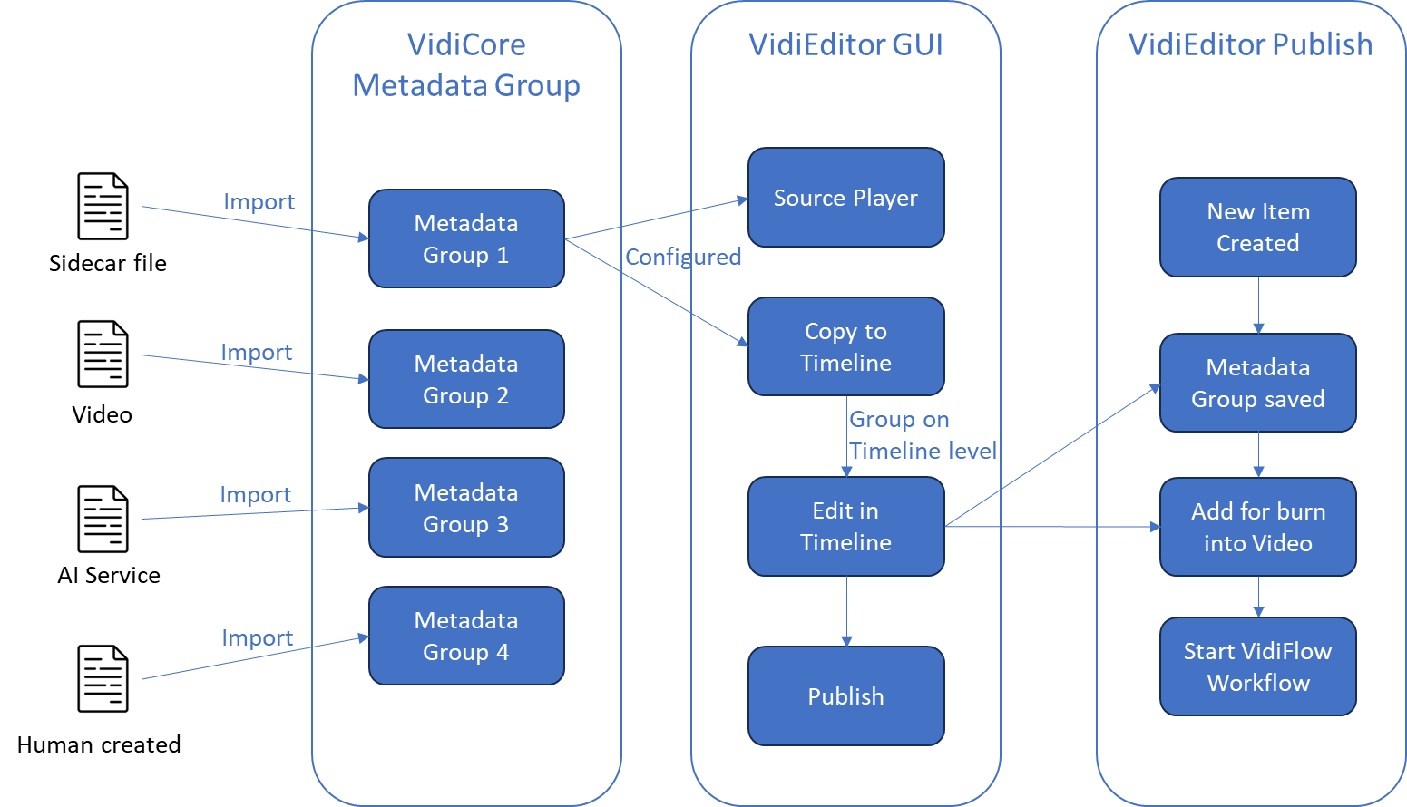 A workflow can also be started if VidiEditor is used in combination with VidiFlow. This should be mentioned here as it might be needed to read the metadata group again to extract it to a subtitle side car file which is a subsequent functionality not done by VidiEditor.