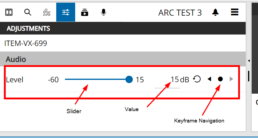 Audio leveling is possible on audio-only items as well as video segments with audio. This can be done by simply selecting a suitable segment with audio and use VidiEditor's effects panel to adjust the levels by using the slider, the input field or by setting a keyframe. Below figure shows the available controls.