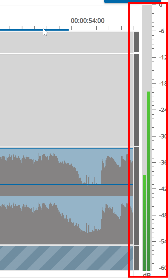 After setting audio level adjustments, the adjustment can be monitored using the VidiEditor's peak meter outputting the adjusted audio level for the timeline mixdown (as shown below).