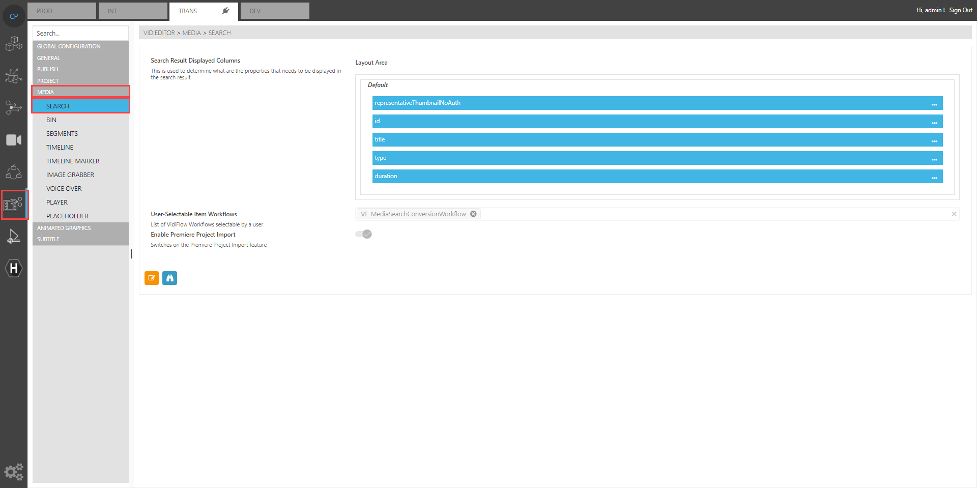The “Search Result Displayed Columns“ configuration allows one to configure metadata fields of the chosen metadata model into the result grid of the media search. In ConfigPortal, an ordered list of metadata can be chosen defining the columns of the media search dialog in VidiEditor. This is used to build the search query send to VidiCore so only configured metadata fields will be used for searching. Also a user preference can be set by users to blend out unneeded columns per user (see User Preferences). In ConfigPortal the setting easily can be made while configuring and ordering a list of the needed metadata: