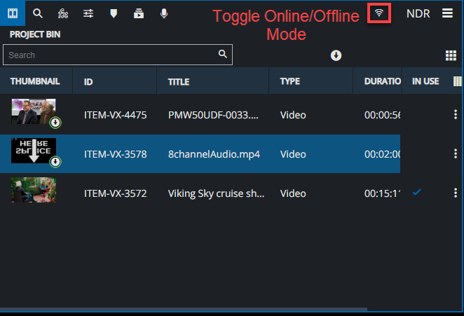 VidiEditor can switch to the offline mode by the user while simply clicking the Online/Offline toggle in the header bar of the media management area.