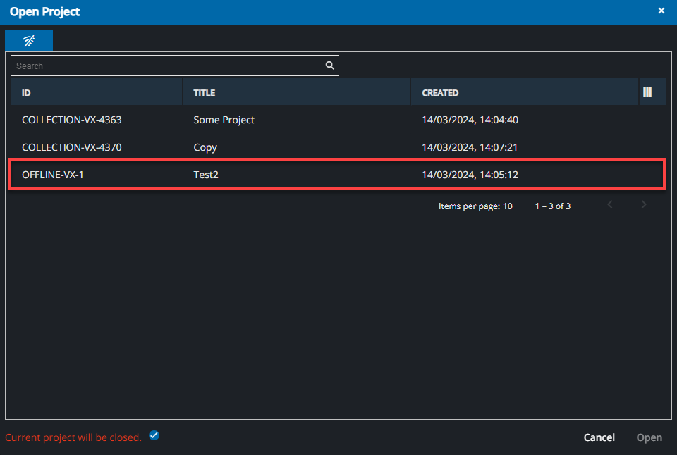 User can see this also in the GUI on Open Project dialogue where an offline created project will be prefixed on the ID Column with “Offline” follow by an ID. This ID will be replaced when later on importing the project into the central MAM: