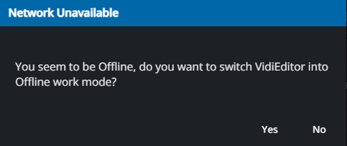 It is up to the user to decide if offline work mode is needed or if the internet connection is suitable for the users needs. So the button must be used to enable offline work mode. For convenience an auto detection was added detecting a presumable bad or not available internet connection. If this detection kicks in, VidiEditor will display an info message about it letting the user to decide continuing in online mode or switching over to offline mode. The message looks as follows: