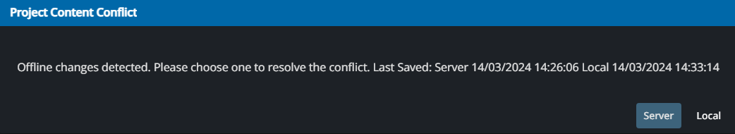 The user needs to decide at this point if the centrally stored project will be overwritten with the offline work or if the centrally stored project state on the server is used and the offline work will be ignored. If the user decides “local” the server project will be overwritten with the local state of the project. If the user choses “server” the server offline project stays offline and can still be used in offline mode.