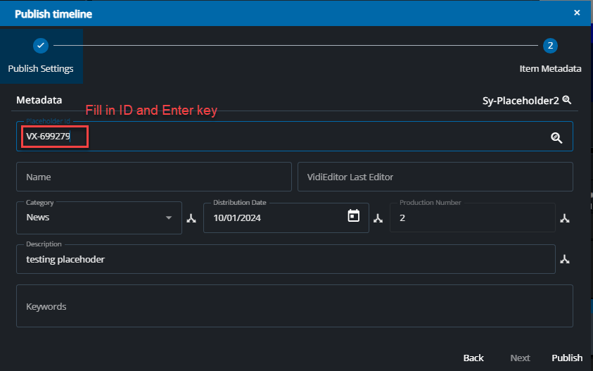 If the user know the placeholder's ID in the VidiCore system it can be easily used for quick assignment while typing it into the Placeholder field and hit enter on the keyboard: