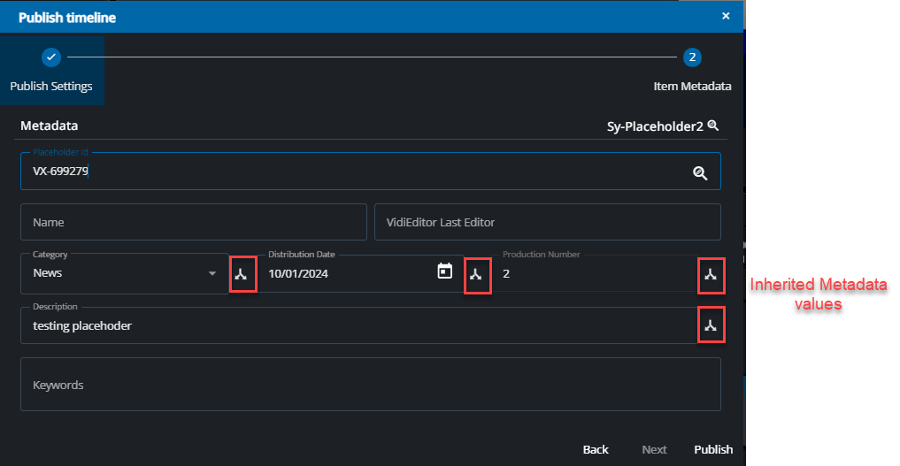 All metadata set for inheritance in the global config will be inherited to the item when publishing. Inside the publish dialog already a subset of metadata might be displayed that inherits metadata from the placeholder to the item. This is indicated via an icon besides inherited metadata: