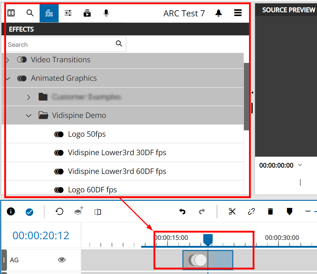 If the feature is configured for your installation the VidiEditor will display a dedicated Animated Graphics (AG) track on the timeline as well as a navigation about the animation templates in the Media Management area. Th track is only usable for animated graphics add on top of the video tracks. The VidiEditor GUI looks as follows: