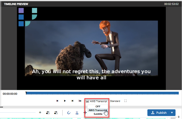 The user has an option to burn in the subtitle into the video outputted on publish. This means the text will be encoded to the video stream. The user can enable this option and choose one of the existing subtitle markers of the timeline:
