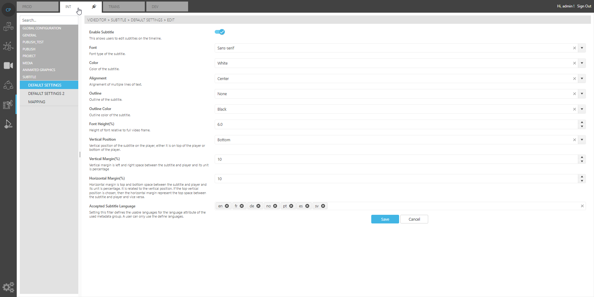 Config Portal → VidiEditor → Subtitle → Default Settings
