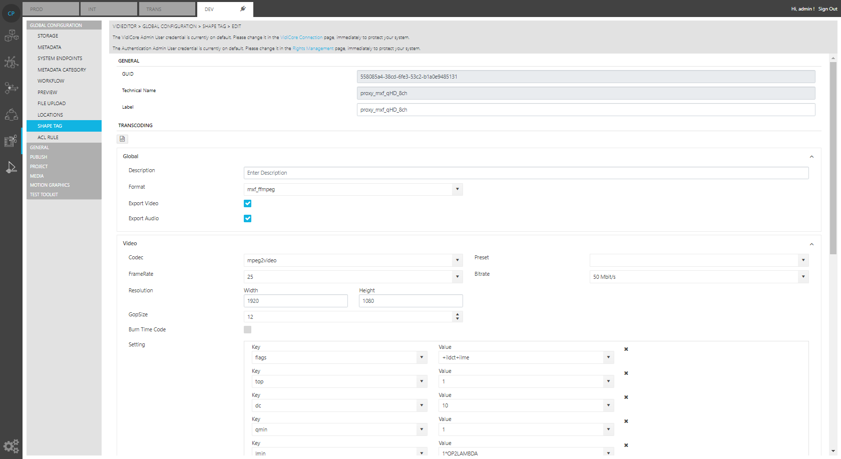 The aforementioned default shape tag to generate proxy videos is inserted during VidiEditor’s installation. It can be used to create proxy files usable by the streaming server and that therefore are suitable for preview in VidiEditor. It is defined as follows for MP4 Proxy: