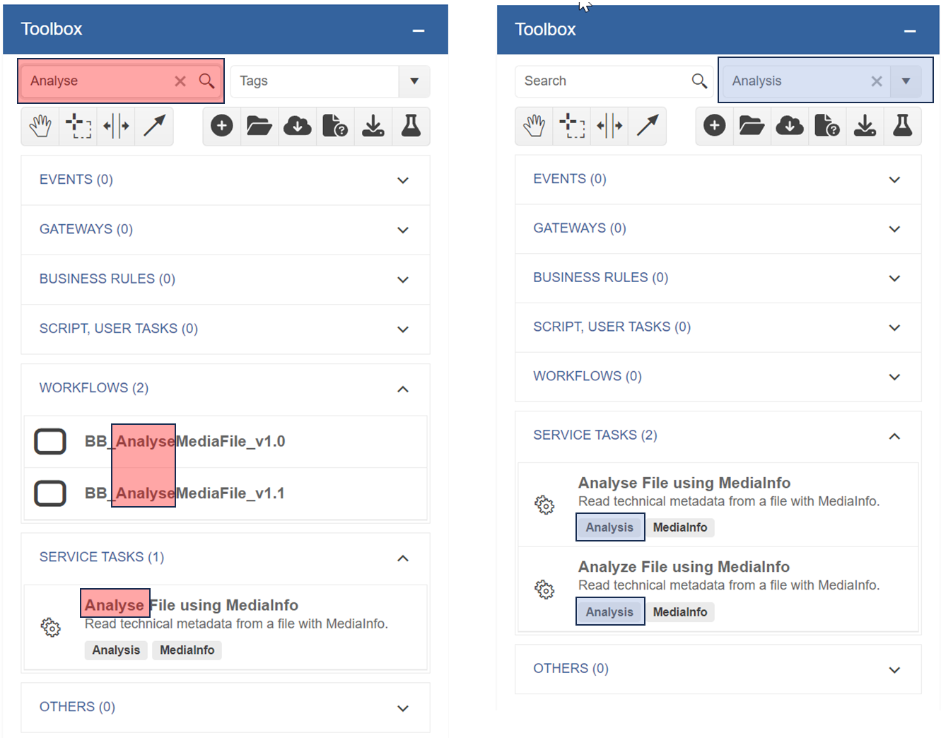 Filter BPMN entities by name (left image, red marking) or tags (right image, blue marking)