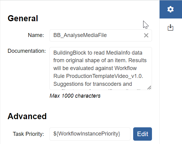 ![]() | Deploy workflow into system: Stores the workflow with a new minor or major version to ConfigPortal and triggers the deployment to the VidiFlow backend. |
