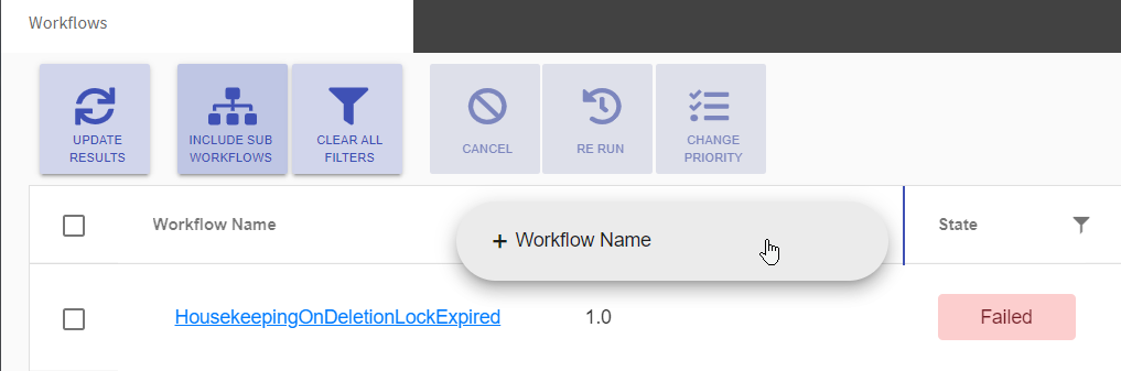If a filter is set, the corresponding button is marked blue (like for Workflow Name and State in the following screenshot: