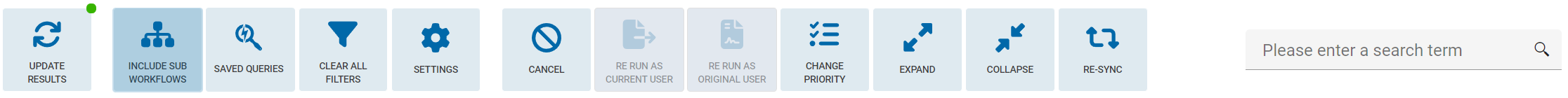 Re-sync: It may happen that the workflow index, where Workflow Monitor is getting its data from, is not reflecting the correct current state. This button also to re-sync the workflow index for a single selected value. When the workflow index was updated, the green indicator on “update results” show light up.