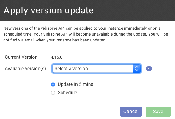 Users in Vidinet Dashboard can now run Vidispine API maintenance by manually update to a newer version, or set up an automatic maintenance schedule.