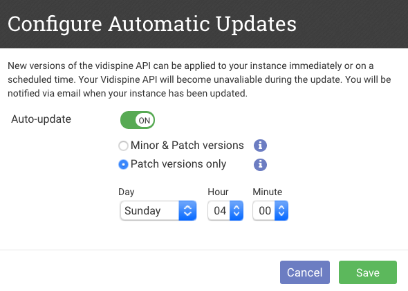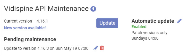 The maintenance panel pictured below is available in the Vidinet Dashboard on each of your services. When launching a new Vidispine API instance, our recommendation is that automatic updates is turned on for patch versions.