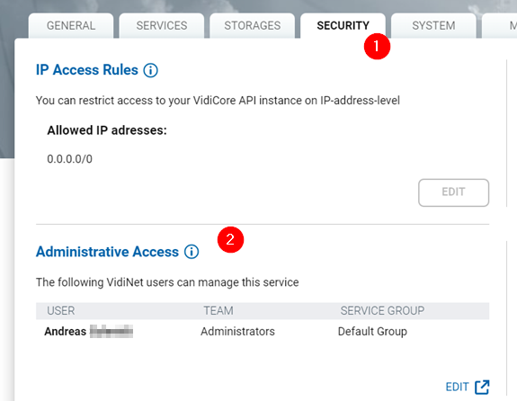 After selecting your the dedicated view for VidiCore, select the Security tab (1). The Administrative Access section will list all the admins as well as which teams they are in included in.