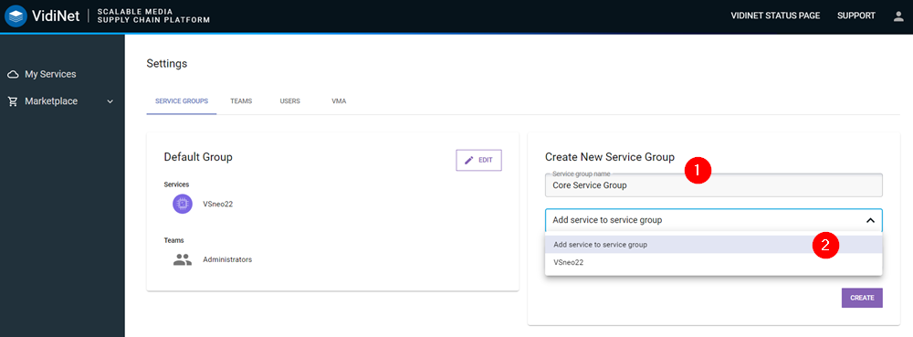 Once in the Service Groups tab, users can manage the different service group that help you organize VidiNet services, the teams attributed to them and billing.
