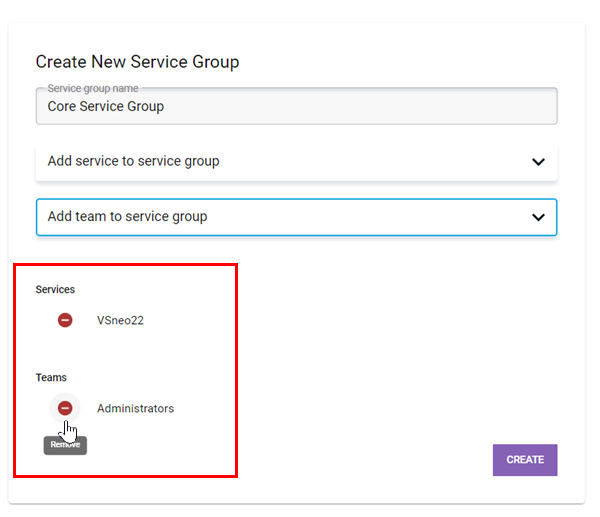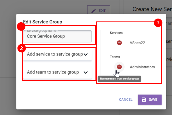 A window will be prompted in which you can then choose to edit the service group name (1), add (2) or remove (3) services and teams.