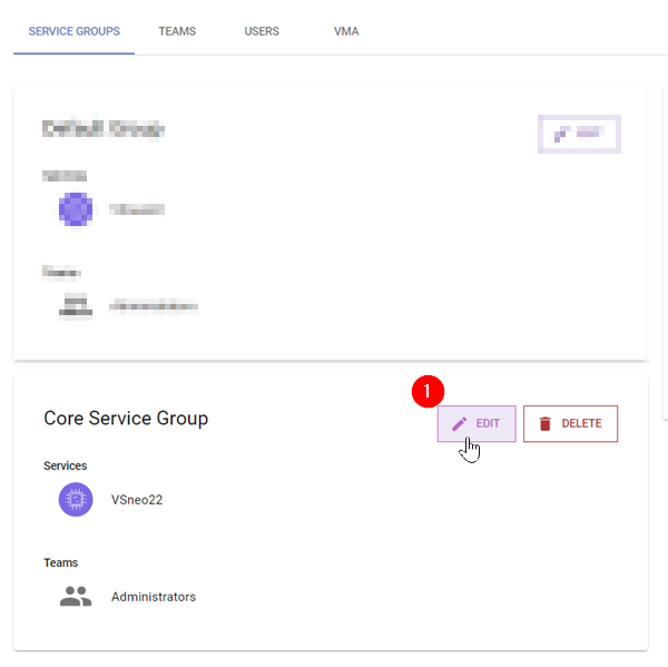 If you want to edit a particular service group, click on the Edit button (1) for that particular group. You will notice that both services and teams attributed to the group are displayed on the group’s tile.