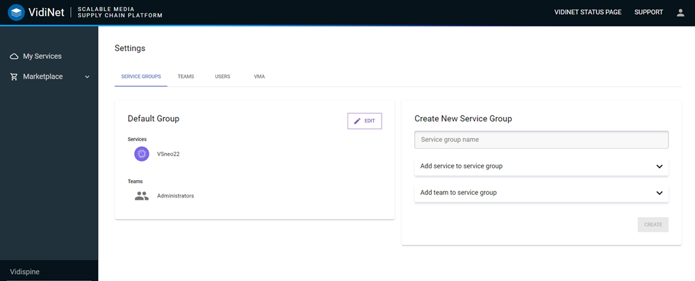 The Settings area on VidiNet is where you configure non-product specific topics at the VidiNet level. These include specifying Service Groups and Teams as well as user management.