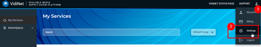 To reach the Settings area, click on the profile icon (1) and select the Settings option (2).