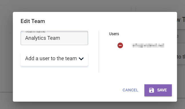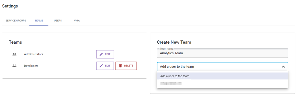 The Teams tab offers an overview of all specified teams and their users. Creating a new team is as simple as entering a name and adding an existing user to the team.