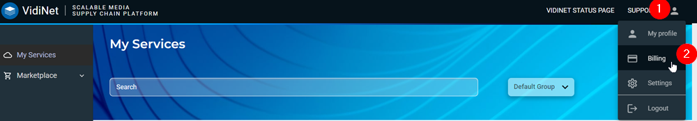 You can reach the Billing area in VidiNet by clicking on the profile (1) icon and selecting the Billing (2) option.