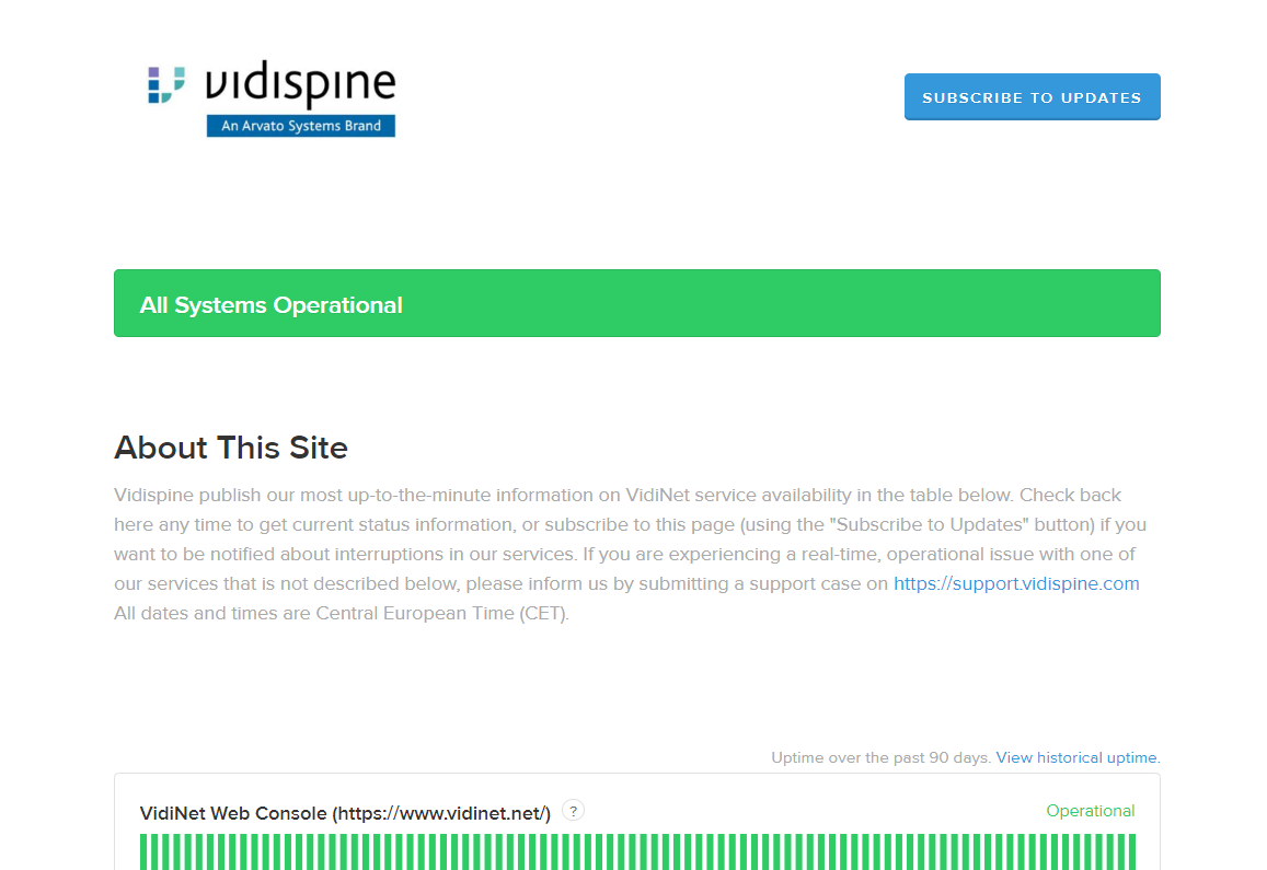 If you are experiencing an issue with VidiNet or any of its services we recommend that you first visit to the VIDINET STATUS PAGE (1). The status page shows the current availability of VidiNet and services. It also offers information on scheduled maintenance and a history of incidents and respective reports.