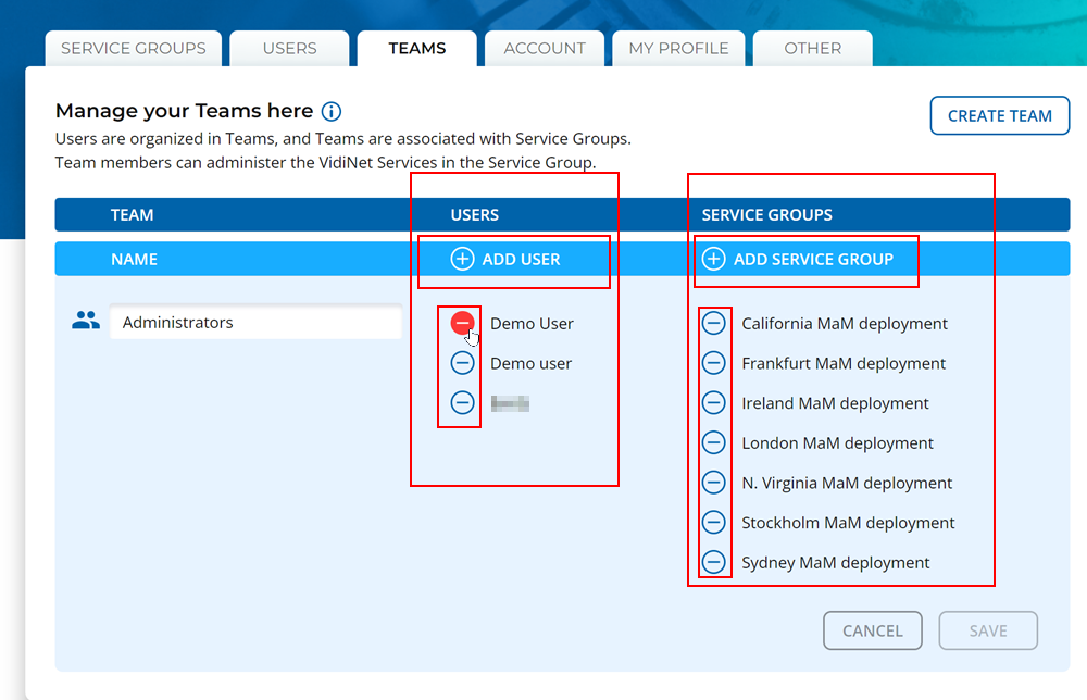 One can add individual users (2) to a team and then assign existing service groups (4) by selecting the plus icon on the respective element.