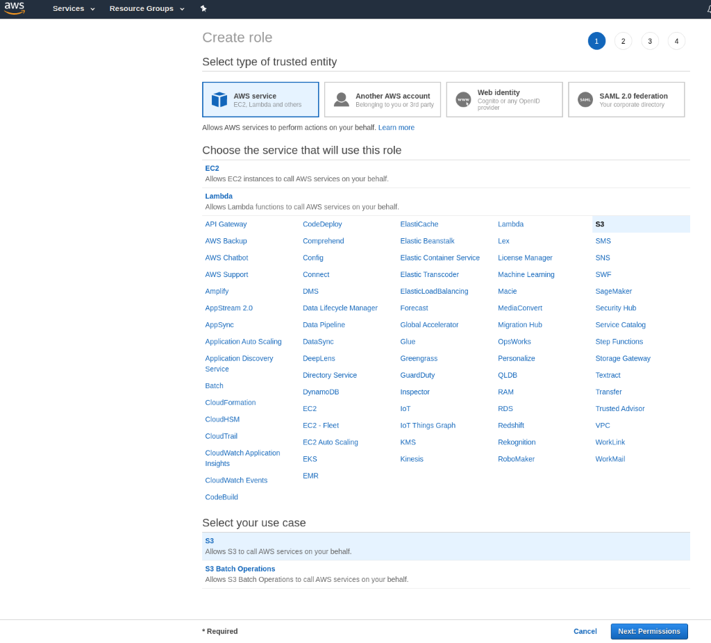 Go to IAM services and choose Role, then click Create. In the first step of creation choose AWS Service, EC2, and S3 and go to the next step.