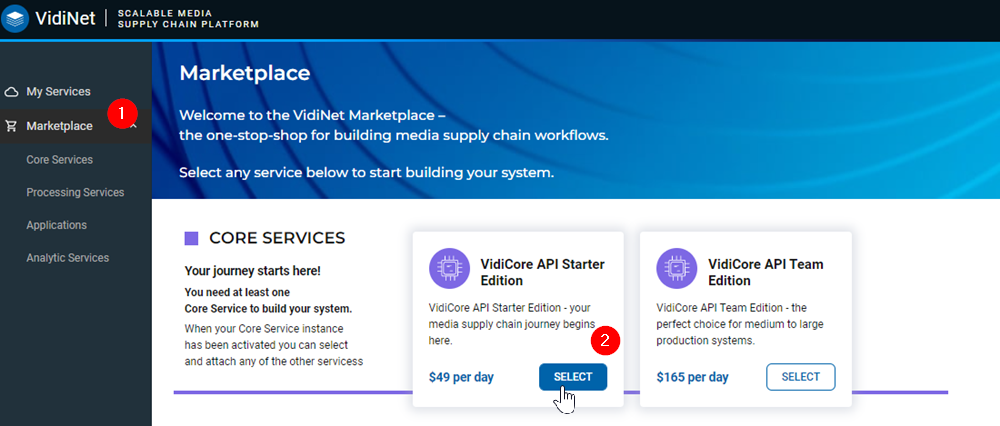 When you first reach VidiNet, you will have no services. In order create a system you need to start off by choosing one the Core Services: VidiCore API Starter or Team Edition. Only once one of these has been set, can one go through the other marketplace categories to add additional services or applications.