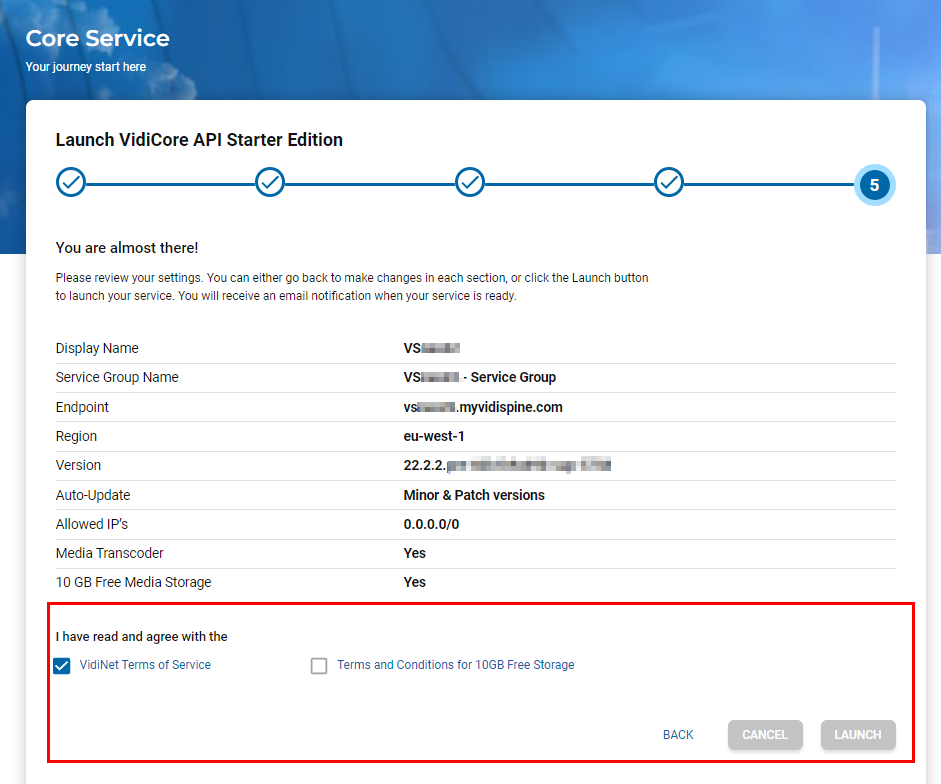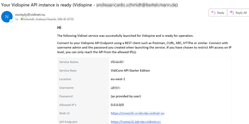 Shortly after selecting launch, you will receive an email confirming that that you service up. But still have to wait for the Vidispine API instance to be available.