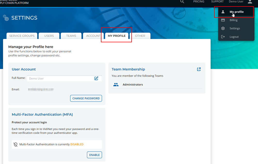 Find your profile settings under “My profile” option in dropdown menu or via the Settings tabs.