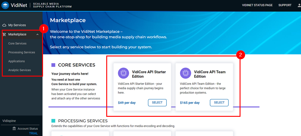 Selecting the Marketplace (1) option on the navigation pane will bring you to an area displaying the full catalogue of services available on VidiNet.