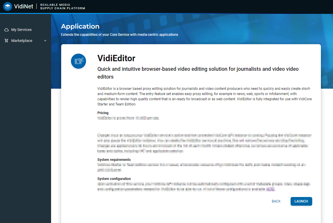 Selecting a service in the Marketplace catalogue will offer an overview the service. Users can then choose to to continue with the launch option to setup the service and include in their system. The service will subsequently show up under my services.