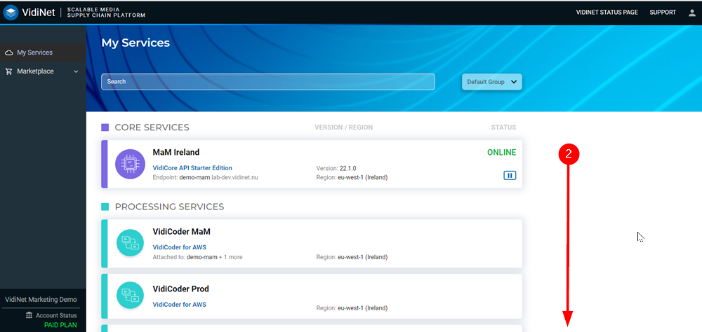 If you’ve set up a VidiCore instance and added services, you will be able to scroll down (2) to your entire catalogue if no group has been selected.
