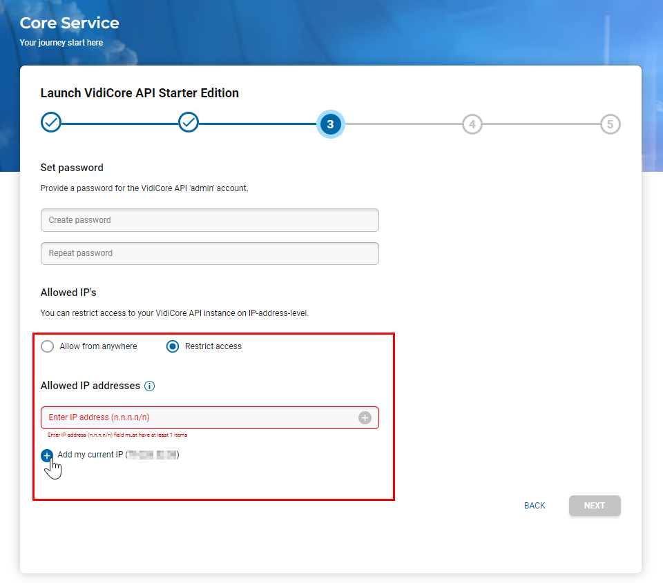 The next phase of the launch allows one to set the admin password as well as to choose whether to restrict access based on an IP address.