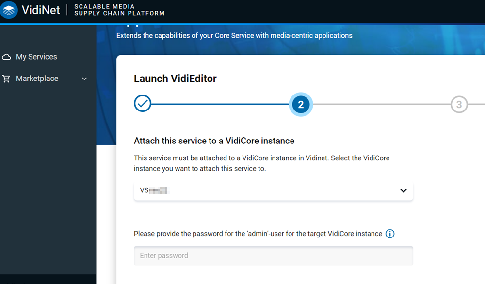 Adding a new service during service creation is simpler. You just have to select what VidiCore instance you want to attach the service to, together with the password for that VidiCore instance. This is done during service creation. Select your VidiCore API, and then you will get an extra text field to enter your admin password for that instance.