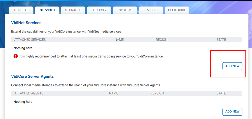 If you want to add services to an already existing VidiCore API instance, you can either start a service from the VidiNet Marketplace section, and then add it to your VidiCore instance using an API call, or you could at service creation choose to add it directly to the VidiCore instance. This articles describes how to do this.