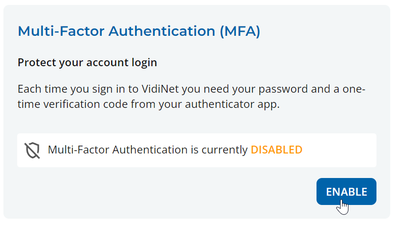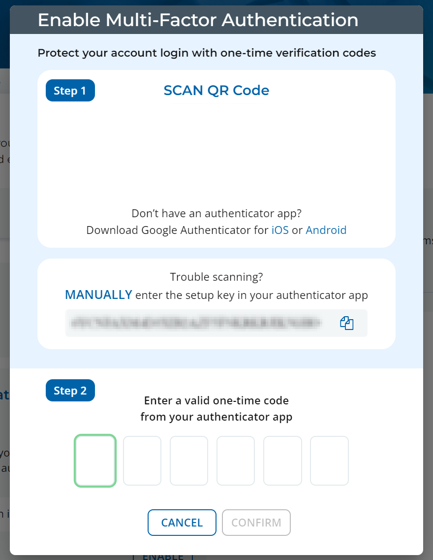 Secure your account by activating multi-factor authentication. Authentication type will not be activated until confirmed with a correct Authentication code. Configure and confirm authentication by clicking “Enable”.