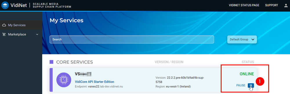 Warning: Deleting your service will permanently delete it. In the case of VidiCore this implies the entire instance along with the database of metadata, but the physical media in the storage are left untouched.