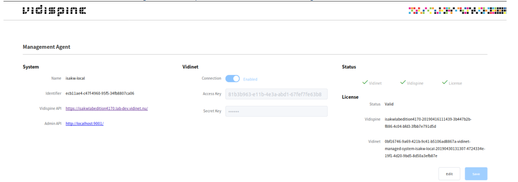 /etc/vidispine/management-agent.yamlvidinet.systemId: f70890fb-4064-41f1-9986-36e36cc86a3d (A UUID)vidinet.systemName(You decide this, it is used to identify your system and will appear under “My Services” in VidiNet Dashboard and also be inserted into license key)vidinet.accessKey(obtained in Step 3a)vidinet.secretKey(obtained in Step 3a)