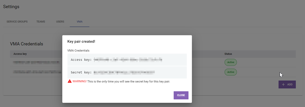 In the VidiNet Dashboard, go to “Settings” and create a VMA access key pair. Remember to copy the Access Key and Secret Key when they are displayed, you will only see the secret key once.