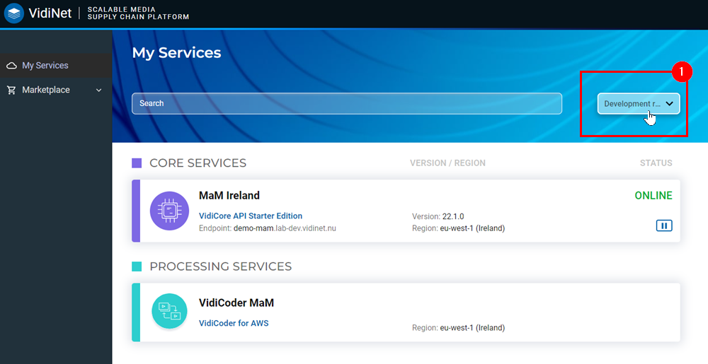 Selecting the Marketplace (1) option on the navigation pane will bring you to an area displaying the full catalogue of services available on VidiNet.