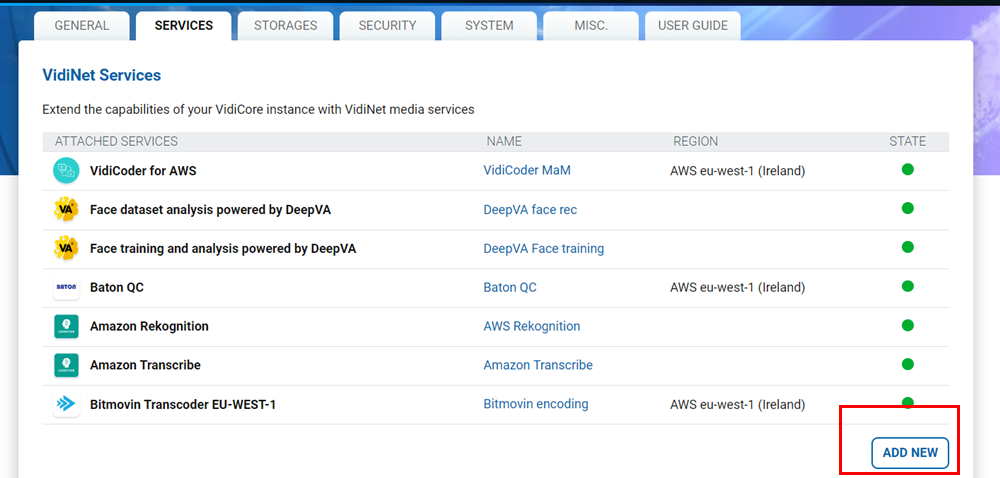 If you want to add services to an already existing VidiCore API instance, you can either start a service from the VidiNet Marketplace section, and then add it to your VidiCore instance using an API call, or you could at service creation choose to add it directly to the VidiCore instance. This articles describes how to do this.